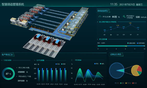鑄造車間全場景多設備生產全過程SCADA數據采集,生產質量數據實時追溯到包次,協助車間提效提質降本。