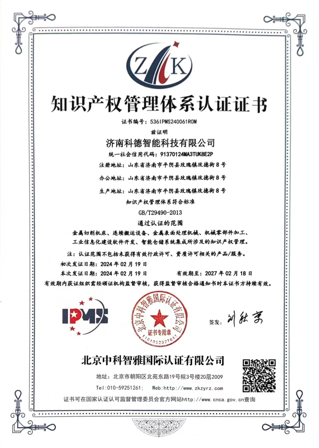喜訊!科德智能通過知識產權管理體系認證
