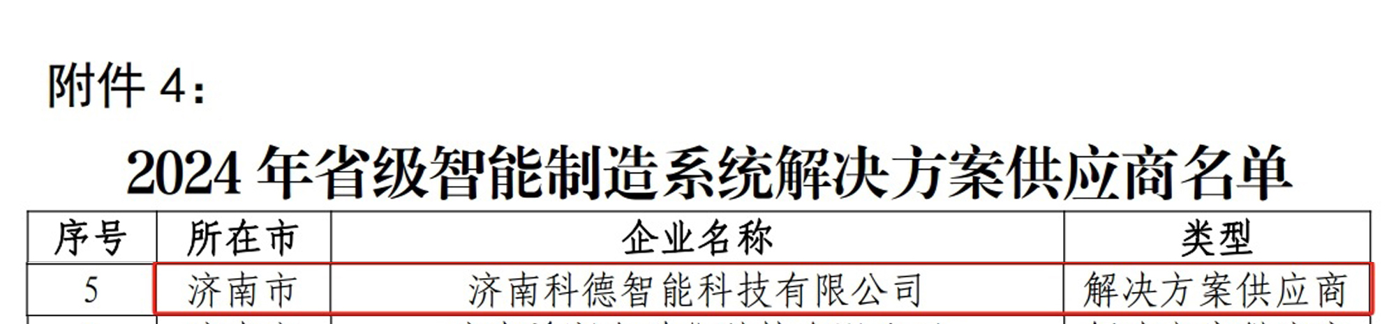 根據(jù)《山東省智能制造場景數(shù)字化車間智能工廠培育認定辦法》《山東省省級智能制造系統(tǒng)解決方案供應商培育認定辦法》(魯工信裝〔2022〕42號),2024年8月12日,山東省工業(yè)和信息化廳發(fā)布“2024年山東省級智能工廠、數(shù)字化車間、智能制造場景和系統(tǒng)解決方案供應商名單的公示”,濟南科德智能科技有限公司獲評“2024年省級智能制造系統(tǒng)解決方案供應商”。