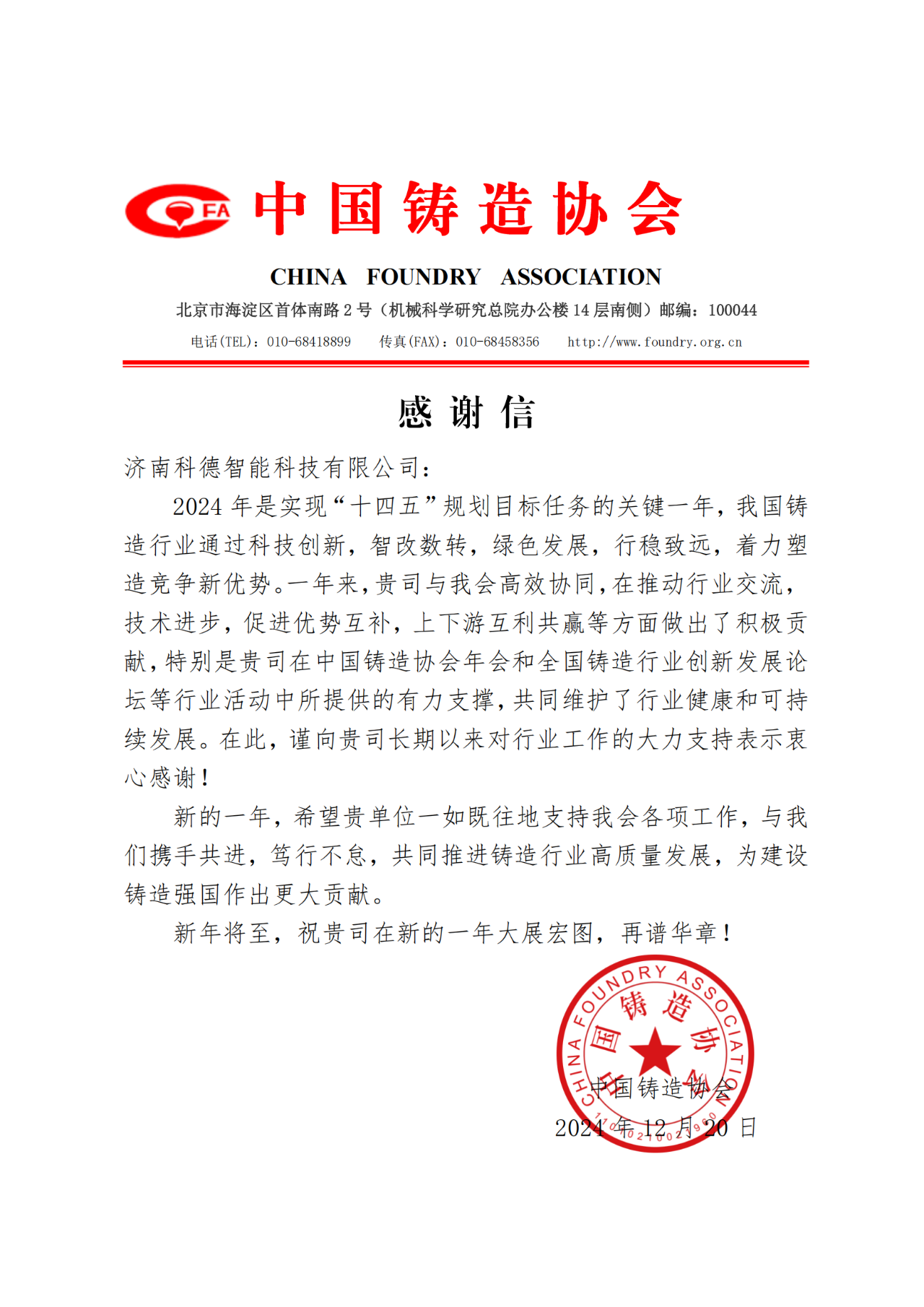 攜手并進,共創輝煌—濟南科德智能科技有限公司榮獲中國鑄造協會2024年度感謝信